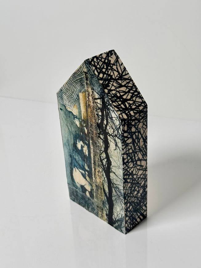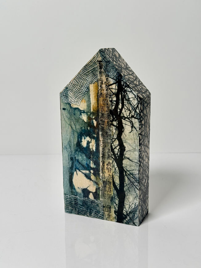 The Settlement Series is a collection of one-of-a-kind House Forms—handcrafted sculptural objects that explore place, structure, and the essence of shelter through collage and material.