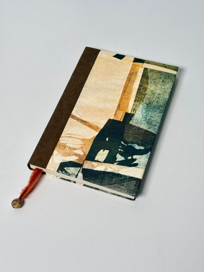 One-of-a-kind handcrafted book featuring original digital collage, natural textures, and hand-stitched pages.